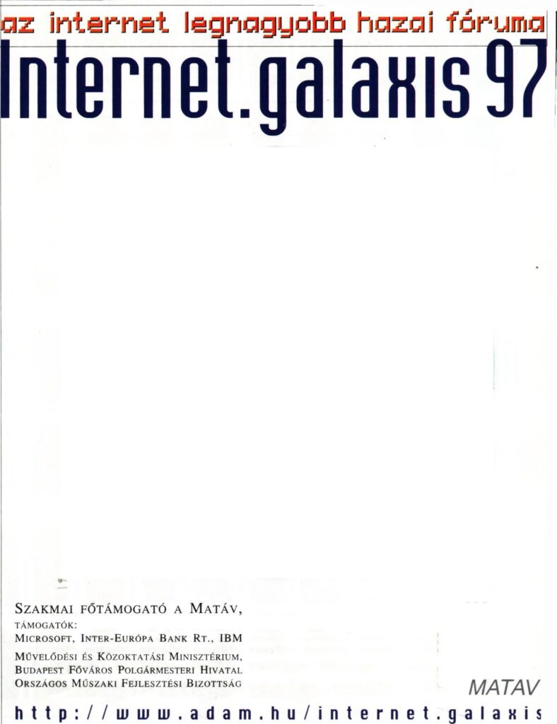 A Szépművészeti Múzeumban 1997. február 27–március 5-e között megrendezett Internet.galaxis című kiállítás és közművelődési, valamint kulturális innovációs rendezvénysorozat katalógusa.